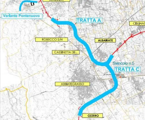 Rimane poi la tratta B. Questo segmento prevede la riqualificazione e il raddoppio della SP 114 tra Abbiategrasso e la Tangenziale Ovest di Milano. La tratta consentirebbe di collegare direttamente la nuova superstrada con il sistema tangenziale urbano. Per l’opera mancano circa 200 milioni di euro di finanziamenti.
