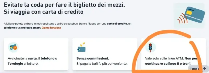 Il contactless vale solo sulle linee ATM e non è accettato sulle linee S che attraversano il passante ferroviario né sui treni degli altri operatori. Nei punti di scambio tra metropolitana e passante (Porta Venezia, Repubblica, Garibaldi, Dateo) il passaggio è fisicamente continuo, ma tariffariamente separato: si deve uscire dalla metro validando la carta ai tornelli e poi acquistare un nuovo titolo per proseguire in ferrovia. Chi tenta di continuare senza biglietto ferroviario risulta privo di titolo valido. In caso di controllo a bordo, mostrare la carta utilizzata in metro non risolve, perché il pagamento non è riconosciuto sul segmento ferroviario e di conseguenza scatta la multa. La discontinuità non riguarda biglietti e abbonamenti tradizionali, che restano validi in base alla tariffa e alle zone acquistate.