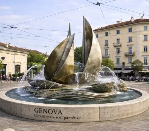 Si potrebbe quindi immaginare di inserire una fontana scenografica al centro del piazzale, come richiamo diretto a Genova, storica città di mare e destinazione originaria della linea ferroviaria. Una composizione scultorea è ispirata al tema delle partenze, con forme che evocano vele spiegate o la prua di una nave, emergenti da una vasca circolare. I getti d’acqua disegnano archi continui, creando movimento e un punto focale visibile da tutte le direttrici. L’elemento d’acqua introduce ordine visivo e riduce la percezione del traffico circostante. Un segno urbano coerente con il nome del luogo.